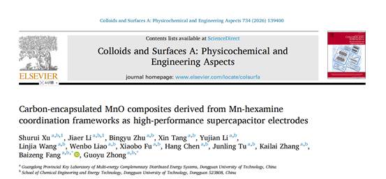 2024级能源动力硕士研究生李家贰以共同第一作者在国际知名期刊《Colloids and Surfaces A: Physicochemical and Engineering Aspects》上发表题为“Carbon-encapsulated MnO composites derived from Mn-hexamine coordination frameworks as high-performance supercapacitor electrodes”创新研究成果,许书瑞副教授为共同第一作者,方百增教授和钟国玉副教授为共同通讯作者,巨乳美女
