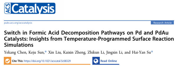 为第一完成单位。研究团队创新性地开发了一种基于DFT计算的高精度温度程序表面反应(TPSR)模拟方法,能够实时追踪反应中间体的浓度随温度的变化,解决了传统表面科学实验中难以获取关键中间体与反应路径信息的难题。该方法成功揭示了PdAu催化剂上甲酸分解路径从纯Pd表面的甲酸盐(HCOO)途径向Pd₂Au表面合金的羧基(COOH)途径发生切换,并明确了活性位点为PdPdAu-like ensemble结构。该成果不仅为甲酸分解制氢催化剂的设计提供了新的理论依据,其TPSR模拟策略还可拓展至其他多相催化反应的机理研究,推动绿色氢能存储与催化材料开发技术的发展。